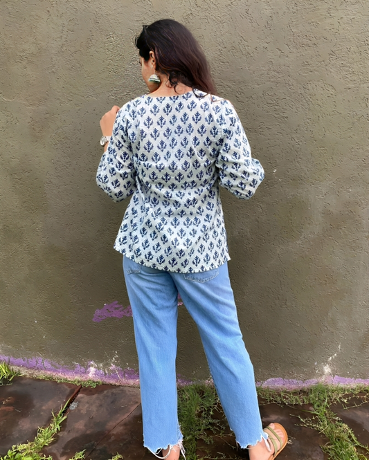 Off-White & Blue Handblock Printed Cotton Top for Women