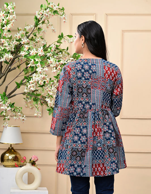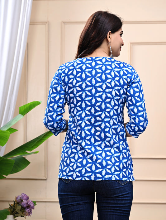 Blue Geometric Print Cotton Top for Women