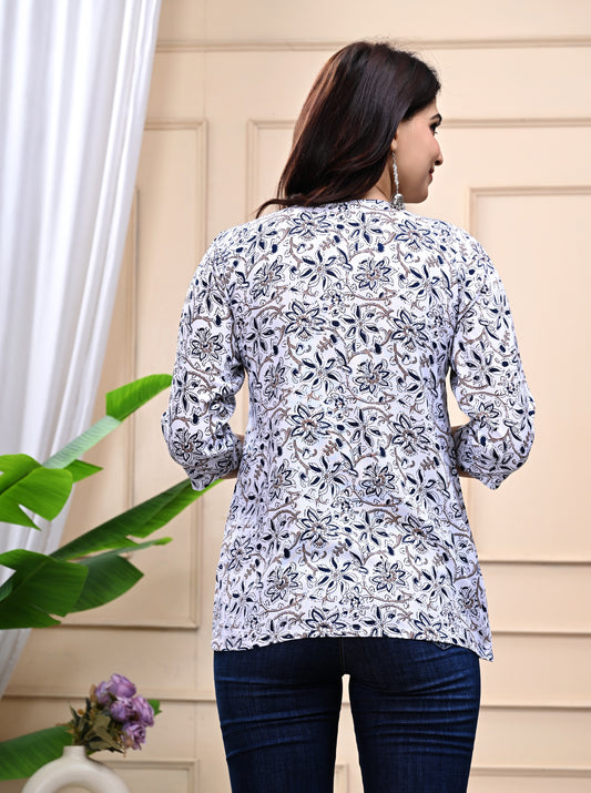 White Floral Printed Cotton Top for Women