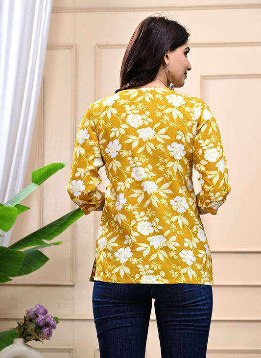 Mustard Yellow Floral Cotton Top for Women