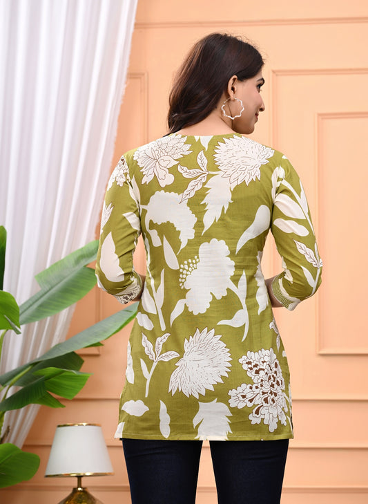 Olive Green Floral Printed Short Kurti for Women