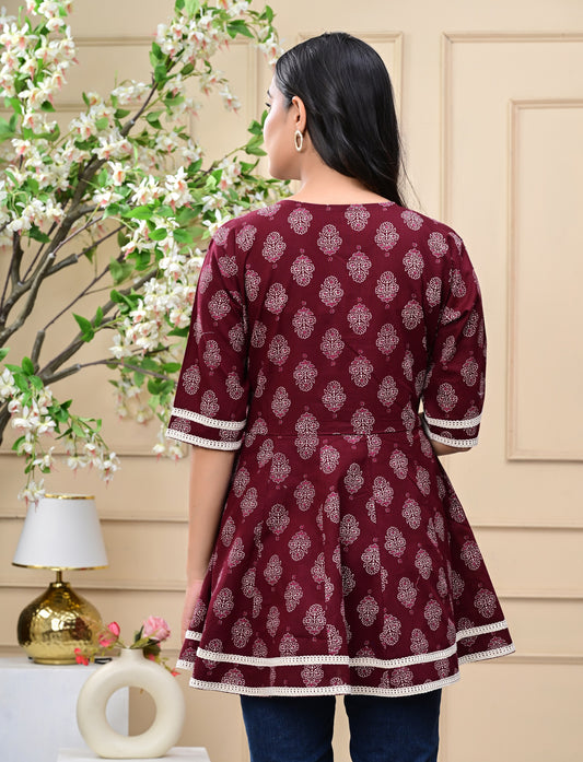 Women's Maroon Wrap Style Printed Cotton Top