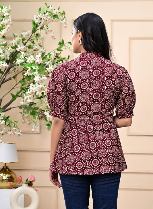 Maroon Fit & Flare Cotton Top with Puff Sleeves and Printed Design